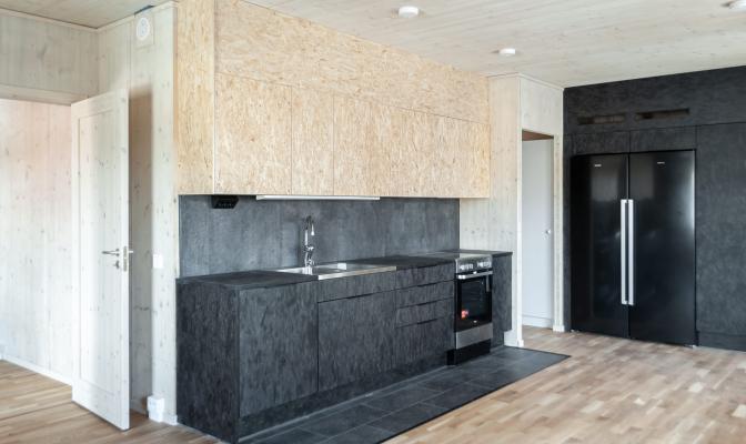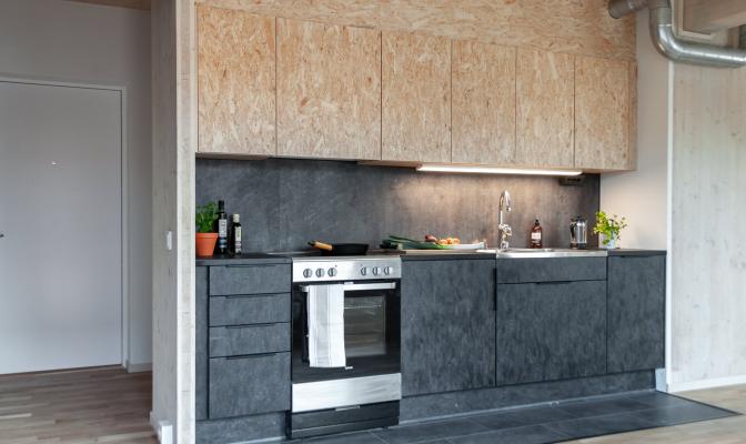 Stommarna är av det senaste sortimentet FosbART precis som luckorna. Stommen består av biokomposit med hyllplan i borstad OSB. Luckan är även den i borstad OSB med kanter av björk. Bänkskivorna i svartlaserad björk kröner verket. Man har även luckats få med skjutdörrar i FosbART för att maximera förvaringen i köken.