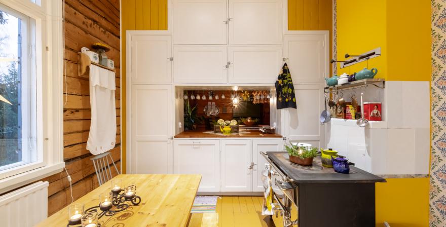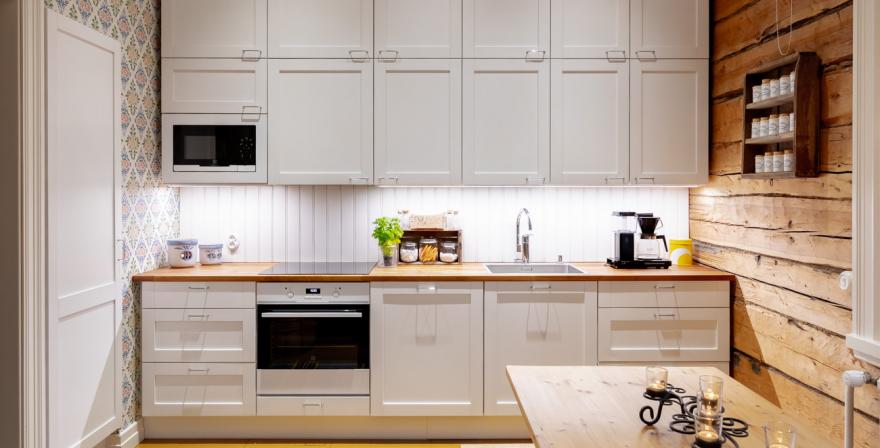 Detta stugkök är verkligen stämningsfullt. Många detaljer får pryda köket på sina tidigare platser. Den nya delen av köket genomfördes med eftertanke och med respekt för traditioner. Flexibla mått, luckmodell, bänkskiva samt material och färger gör helheten harmonisk.