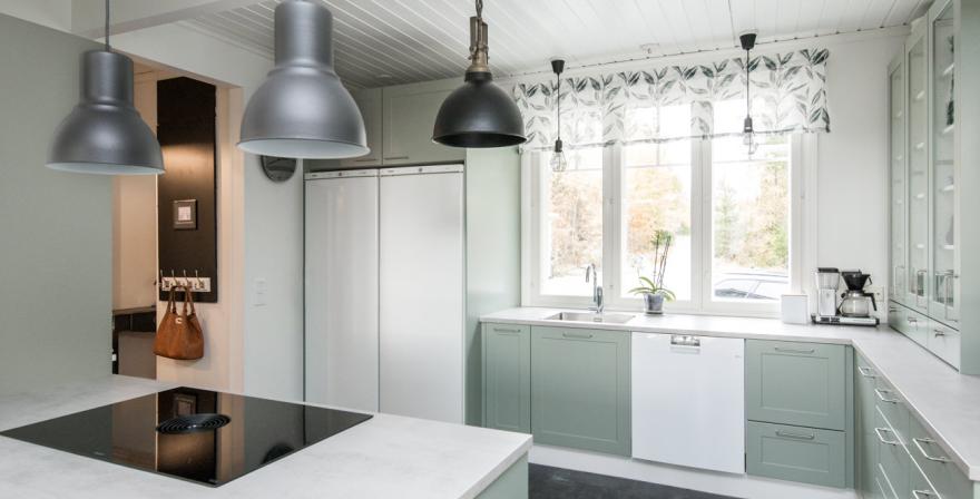 Köket har en snygg och hemtrevlig inredning med bänkskiva. Bakom vitrinluckorna hittar du också kärlen lätt. Det är lätt att förvara kökets små tillbehör i skåpens nedre del. Naturligt ljus flödar utan hinder in i köket, eftersom de övre skåpen har ersatts med lådor. Ett kök utan övre skåp är ett alternativ i ett rymligt kök. Den vitkaklade väggen skapar gamla tiders stämning i lantköket.