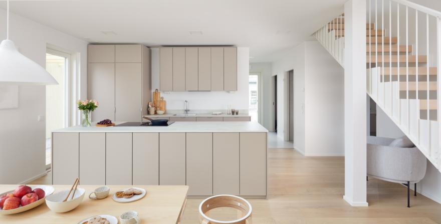Detta kök erbjuder en harmonisk helhet där köksön spelar en central och funktionell roll. Genom att välja högre skåp och sänka sockeln har ergonomin optimerats, och vitvarorna på köksöns nedre del är diskret dolda från vardagsrummet. I resten av köket är vitvarorna smart integrerade för ett enhetligt utseende. Skåpen når hela vägen upp till taket, vilket ger gott om förvaring utan att kompromissa med designen.