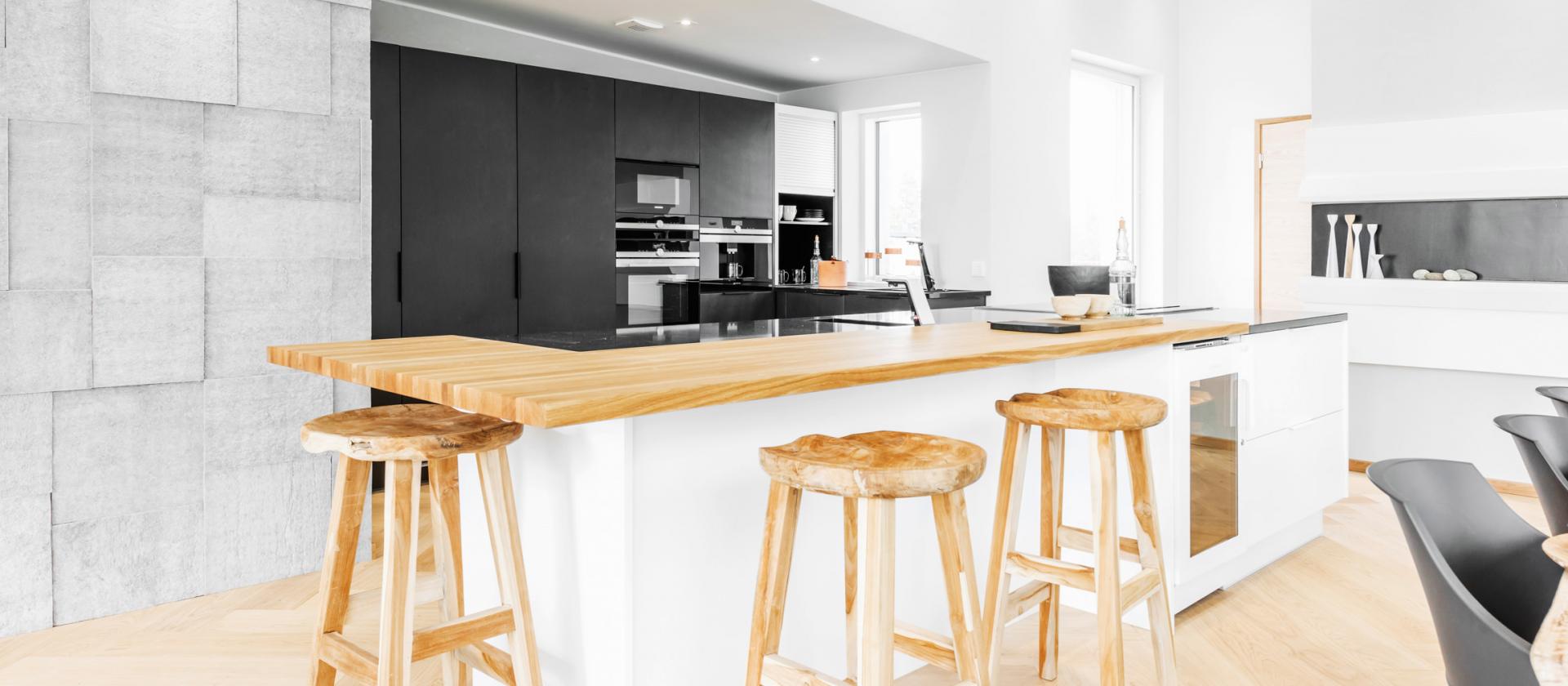 Luckorna av björk i köksskåpen är i svarta och vita toner. Trä i naturlig färg i bänkskivor, inventarier och golv gör helheten enhetlig. En köksö är en utmärkt lösning i vardagens sysslor, men underlättar också vid festliga tillfällen, när en dukning med ett tappställe är ren lyx.