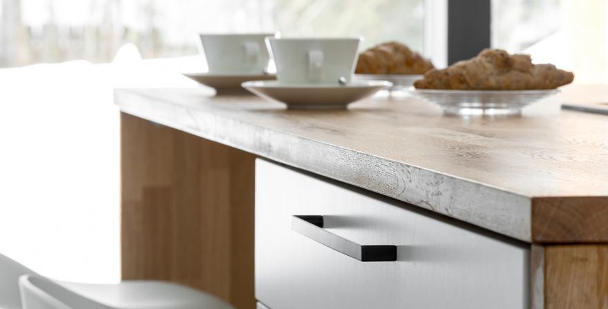 Det stora och ljusa köket delas fint av en köksö. Köksön fortsätter med en matbordsskiva som är försedd med ett tjockt, färglöst glas. Vardagskärlen ryms bra på kökssidan, där de är lättillgängliga. Kökets vita luckor är av björk och bänkskivorna av oljad ek.