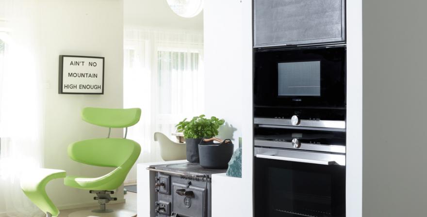 Svartvitt, arkitektoniskt och fungerande. Sådant är detta kök. Köksön är av rejäl storlek och har en integrerad spis och dessutom fläkt. Det är bra att veta att köket ifråga om material, tillverkningssätt och ursprung är ekologiskt. Kunskap är viktigt, för då kan vi påverka.