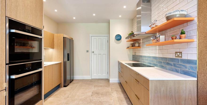 Köksinventarier med träytor skapar stämning också i ett stort kök. Orange och turkos har använts som kryddande färger. Skåpen har försetts med breda lådor och i dem ryms både kärl och bestick. Kökets alla inventarier har tillverkats ekologiskt och man har beräknat koldioxidavtrycket.