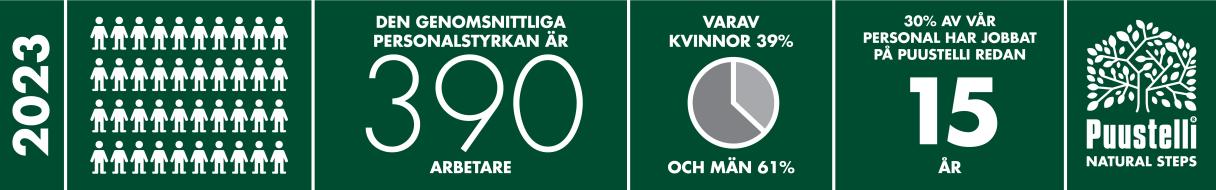Var och en av våra anställda har en viktig roll när det gäller att uppnå de gemensamma målen. Vi värdesätter jämlikhet, och vi accepterar inte diskriminering i vår arbetsgemenskap. Vi sammanträder regelbundet med våra anställda för att diskutera ärenden som gäller jämlikhet på arbetsplatsen och jämlika löner. Syftet med samarbetet är att säkerställa en jämlik och transparent verksamhet i hela Puustelli. År 2023 var 39 % av våra anställda kvinnor och 61 % män.