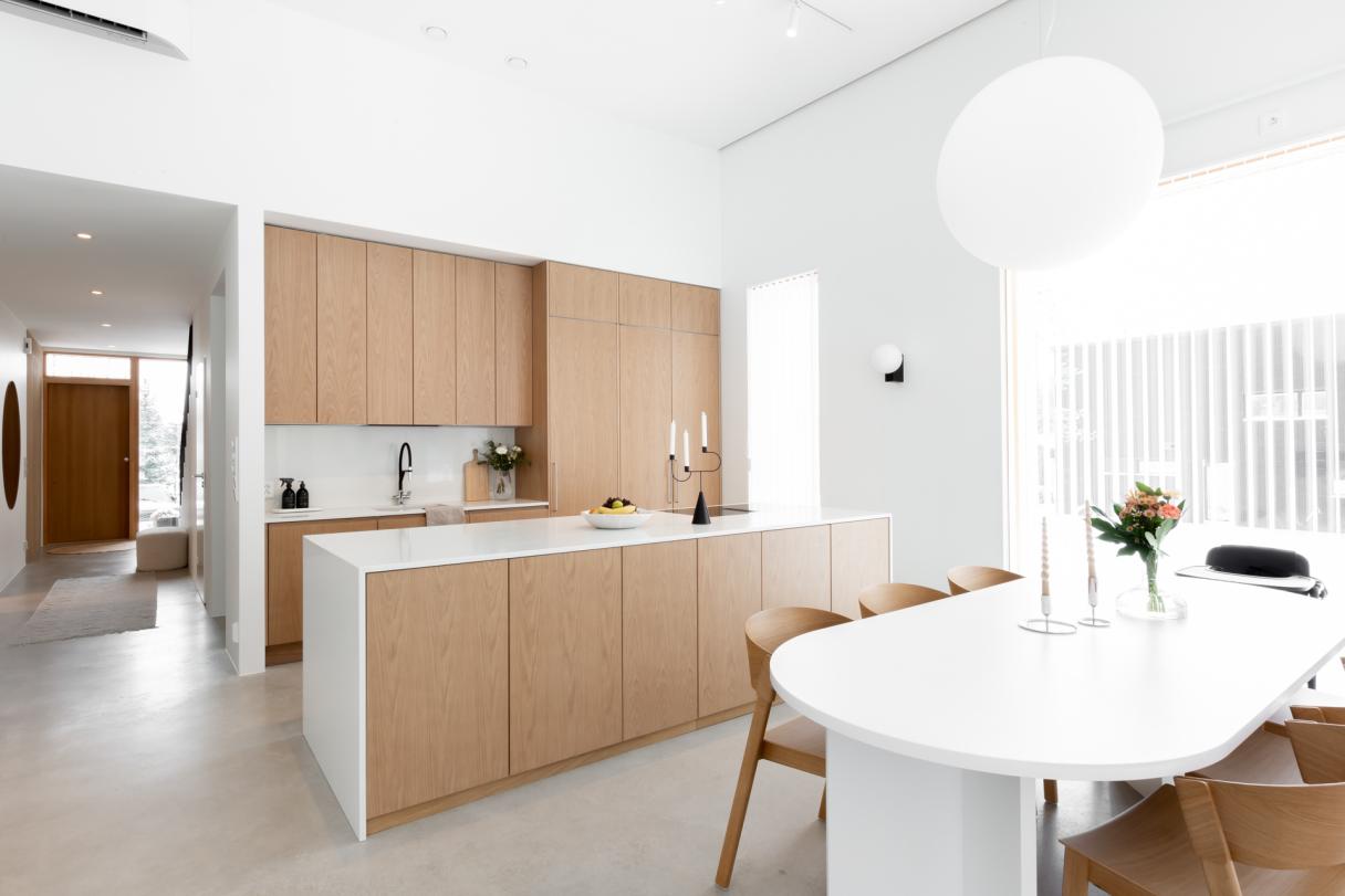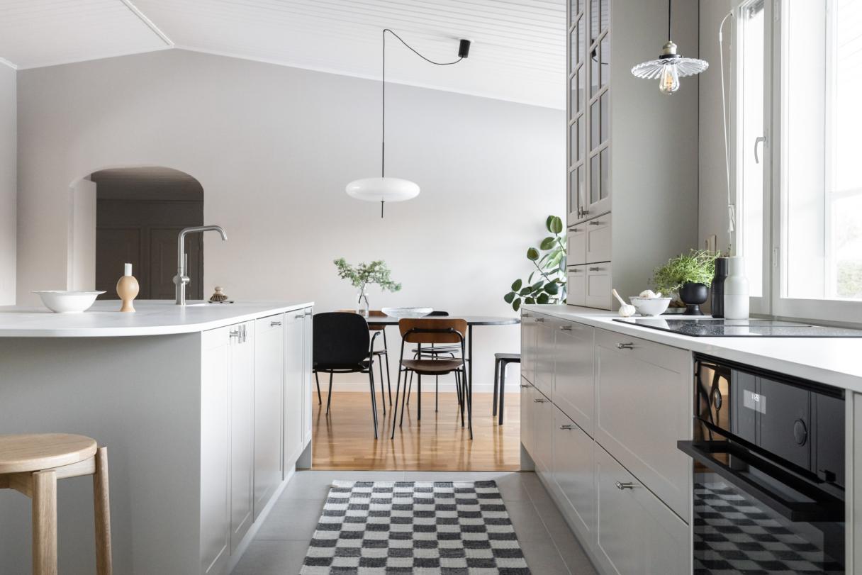 Villa Honkaranta är inrett i mjuka toner där materialval och färger ger en exklusiv känsla. Köket är inrett med Variant- och Storyluckor i utförandena Cashmere respektive Valnut. Valnöten letar sig även in som beklädnad i skåp och vitrin för att ge en ombonad känsla och skapa ett djup.