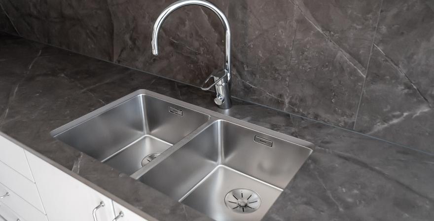 Luckor och lådfronter är ljusgrå från vår PerfectSense-serie och såväl bänkskivor som stänkskydd är i specialkvarts från Dekton.